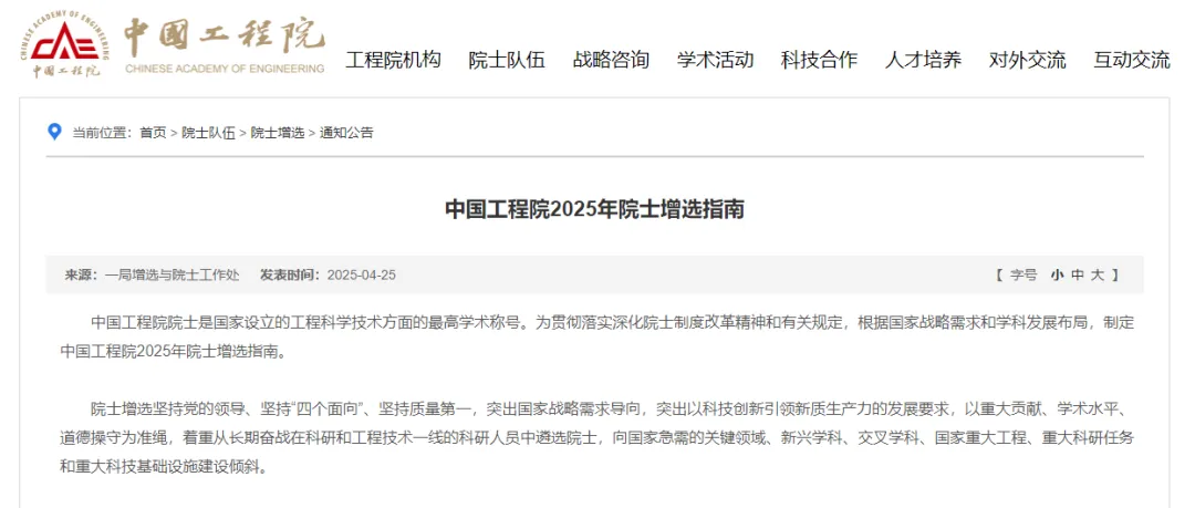 4月25日,中国工程院和中国科学院发布2025年院士增选指南,两院院士增选工作正式启动。