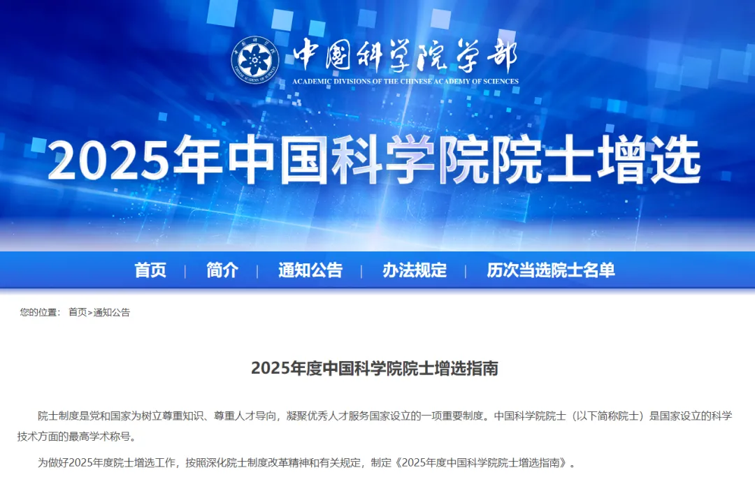 为做好2025年度院士增选工作,按照深化院士制度改革精神和有关规定,制定《2025年度中国科学院院士增选指南》。