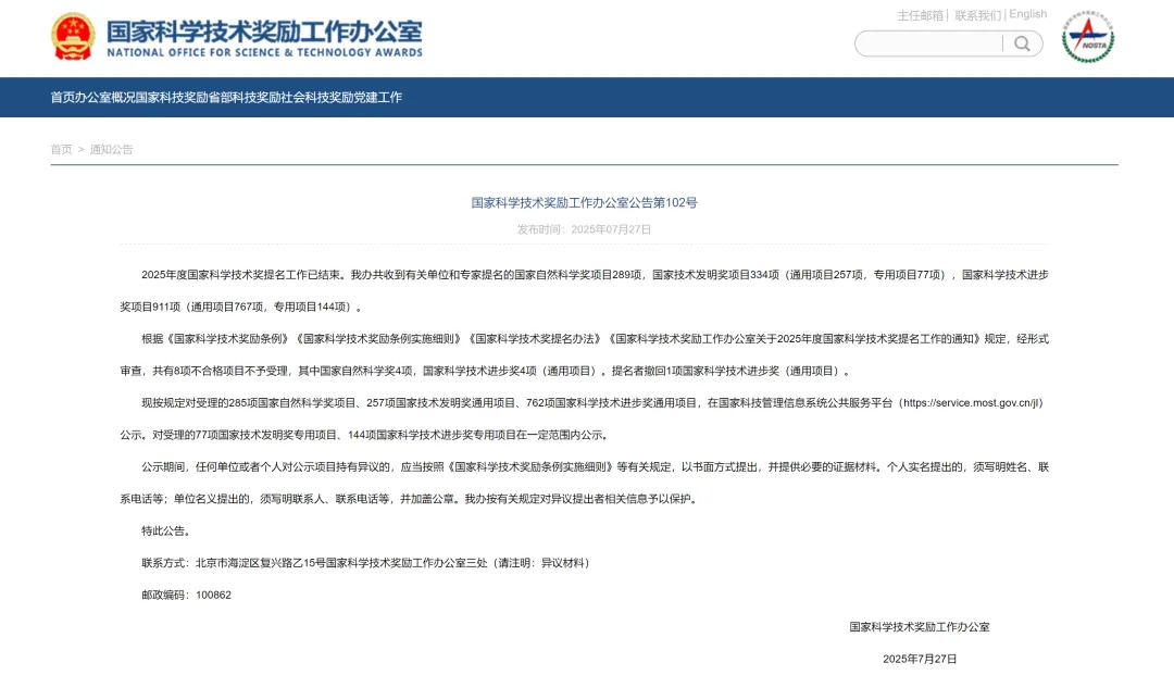 7月27日,国家科学技术奖励工作办公室公告第102号发布。根据公告,国家奖励办共收到有关单位和专家提名的国家自然科学奖项目289项,国家技术发明奖项目334项(通用项目257项,专用项目77项),国家科学技术进步奖项目911项(通用项目767项,专用项目144项)。经形式审查,共有8项不合格项目不予受理,其中国家自然科学奖4项,国家科学技术进步奖4项(通用项目)。提名者撤回1项国家科学技术进步奖(通用项目)。