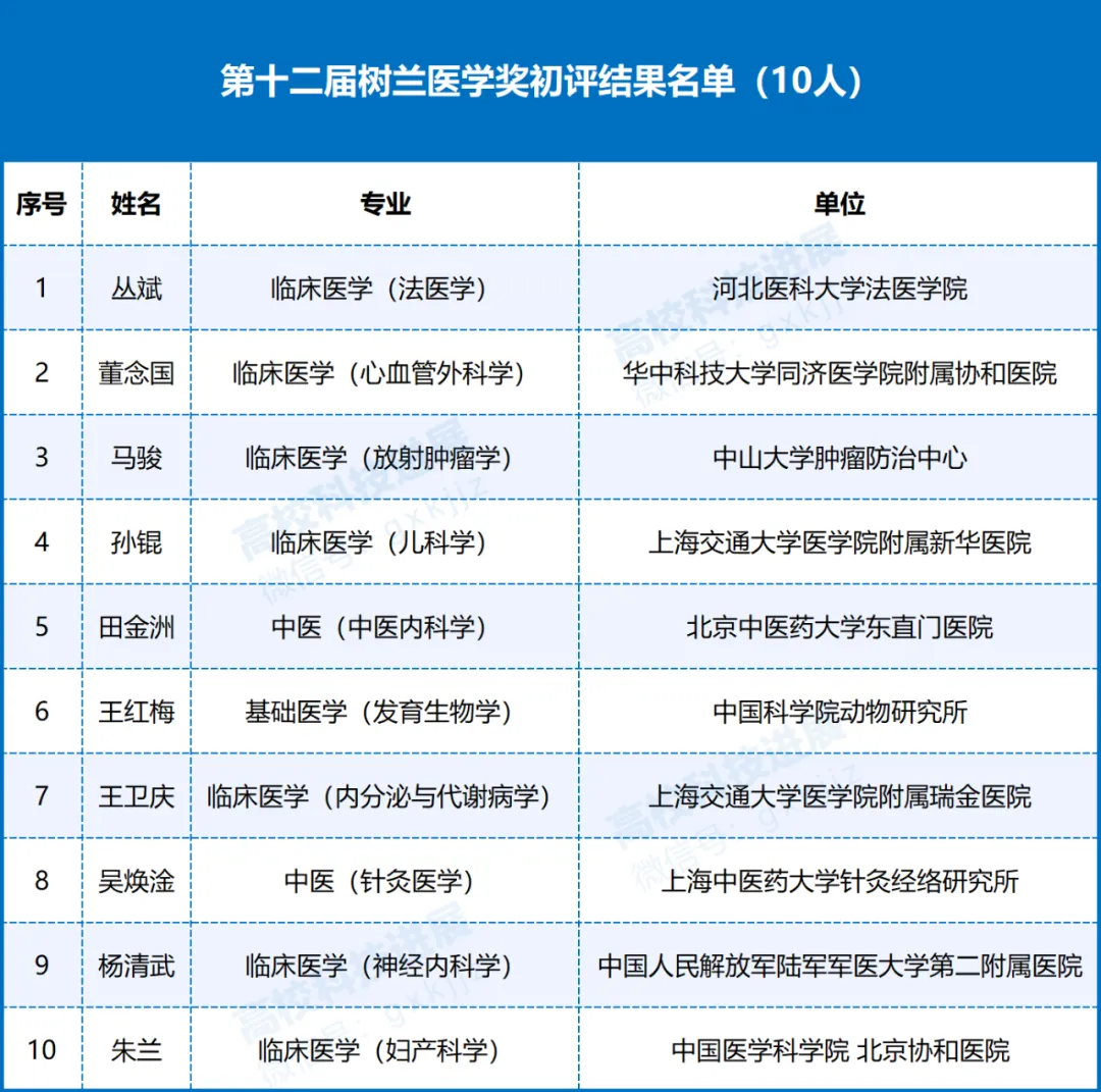 第十二届树兰医学奖初评结果名单: