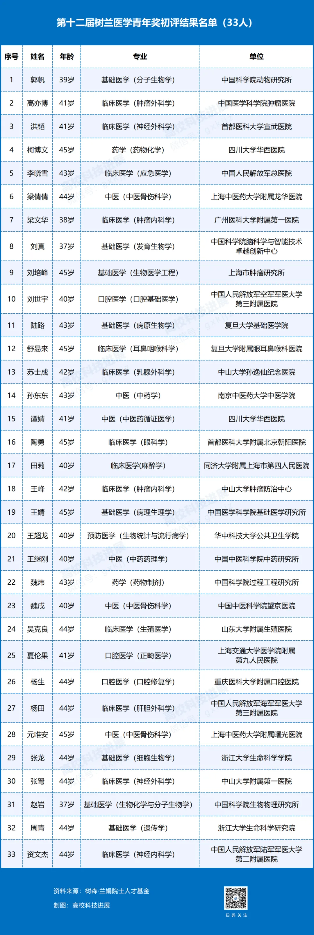 第十二届树兰医学青年奖初评结果名单: