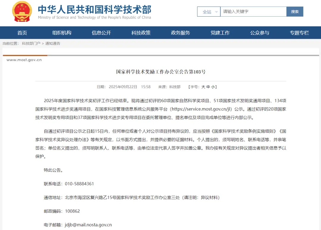 公告显示,2025年度国家科学技术奖初评工作已经结束。现将通过初评的60项国家自然科学奖项目、51项国家技术发明奖通用项目、134项国家科学技术进步奖通用项目,在国家科技管理信息系统公共服务平台(https://service.most.gov.cn/jl)公示。通过初评的20项国家技术发明奖专用项目和37项国家科学技术进步奖专用项目在委托管理单位、提名单位及项目完成单位等进行内部公示。