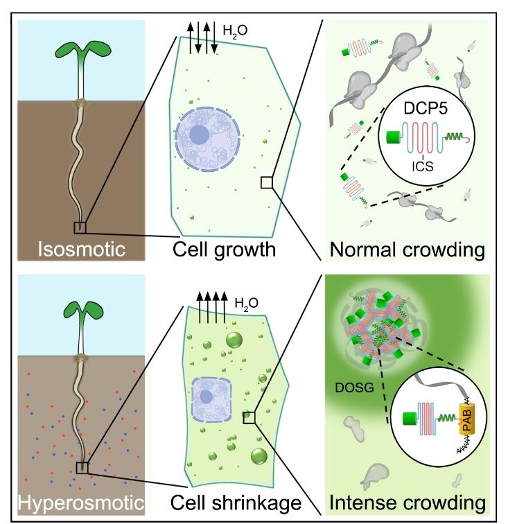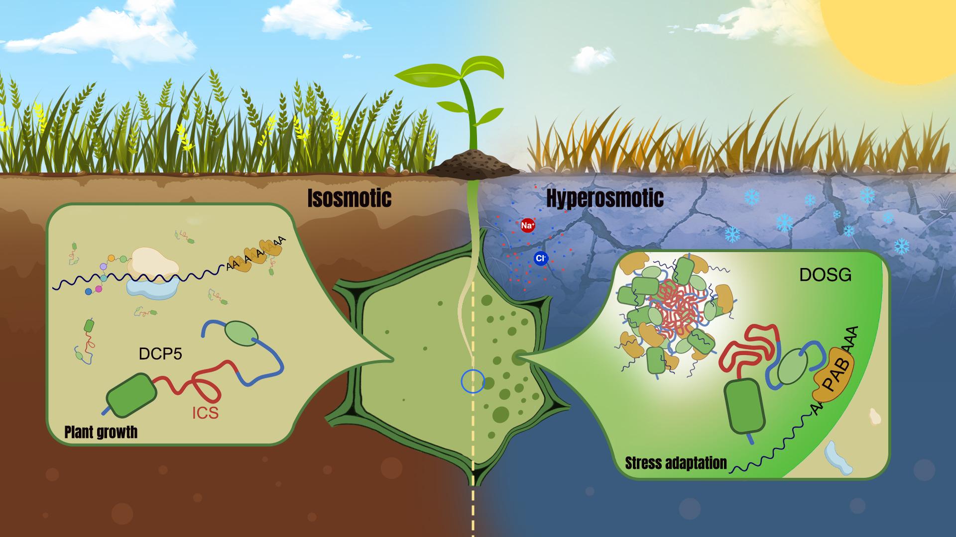 综上所述,团队在该研究中发现了分子拥挤敏感蛋白 dcp5 可作为多功能的植物渗透感受器 (osmosensor),通过相分离介导一个细胞质中渗透胁迫感知与适应的全新机制。该机制的发现证实了细胞渗透压感知可在细胞内部非膜结构实现的猜想。与经典的由信号转导过程实现的渗透胁迫应答途径不同,dcp5 在感知渗透胁迫的同时直接实现了胁迫应答,无需额外的信使分子参与,因而更具时效性。而由 dosg 装配引发的翻译调控也代表了植物渗透胁迫适应过程中的一个新层次。此外,该研究也为蛋白无序区作为胞内环境理化性质感受器的观点提供了重要的实验证据。