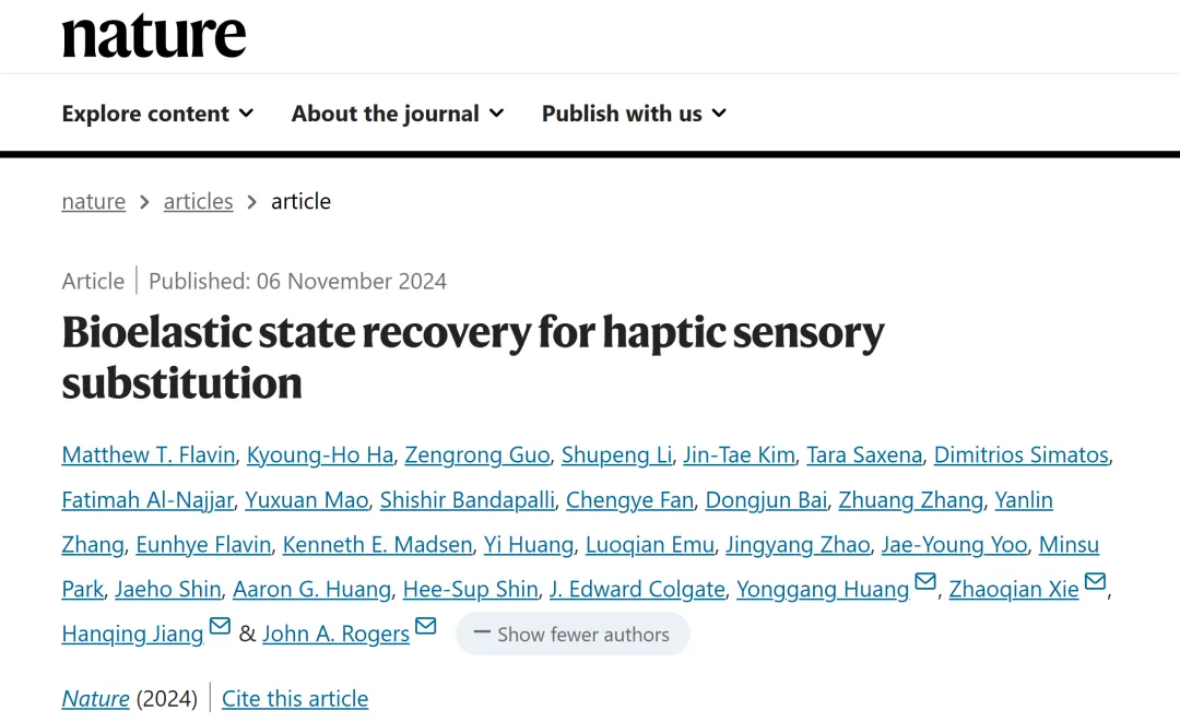 11月7日,大连理工大学力学与航空航天学院、工业装备结构分析优化与cae软件全国重点实验室解兆谦教授(共同通讯作者)与美国西北大学john a. rogers教授课题组、黄永刚教授课题组及西湖大学姜汉卿教授课题组合作,在《自然》(nature)上发表了题为“基于生物弹性状态恢复的触觉感官替代”(bioelastic state recovery for haptic sensory substitution)的研究论文。这是解兆谦教授继2022年作为主要作者在《科学》(science)发表“外周神经可逆传导阻滞的柔软且生物可吸收冷却器”(soft, bioresorbable coolers for reversible conduction block of peripheral nerves)一文后取得的又一项重要成果。