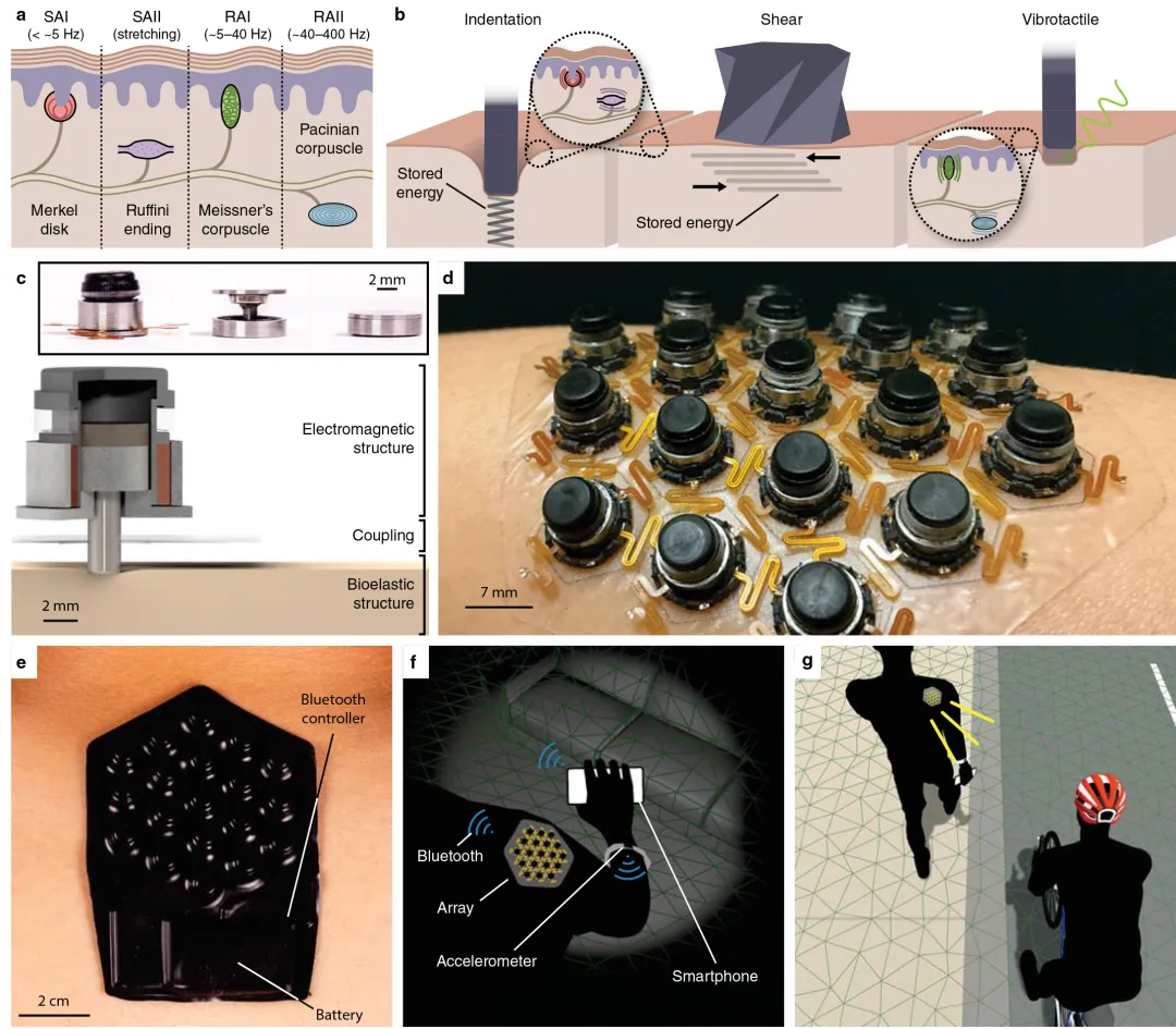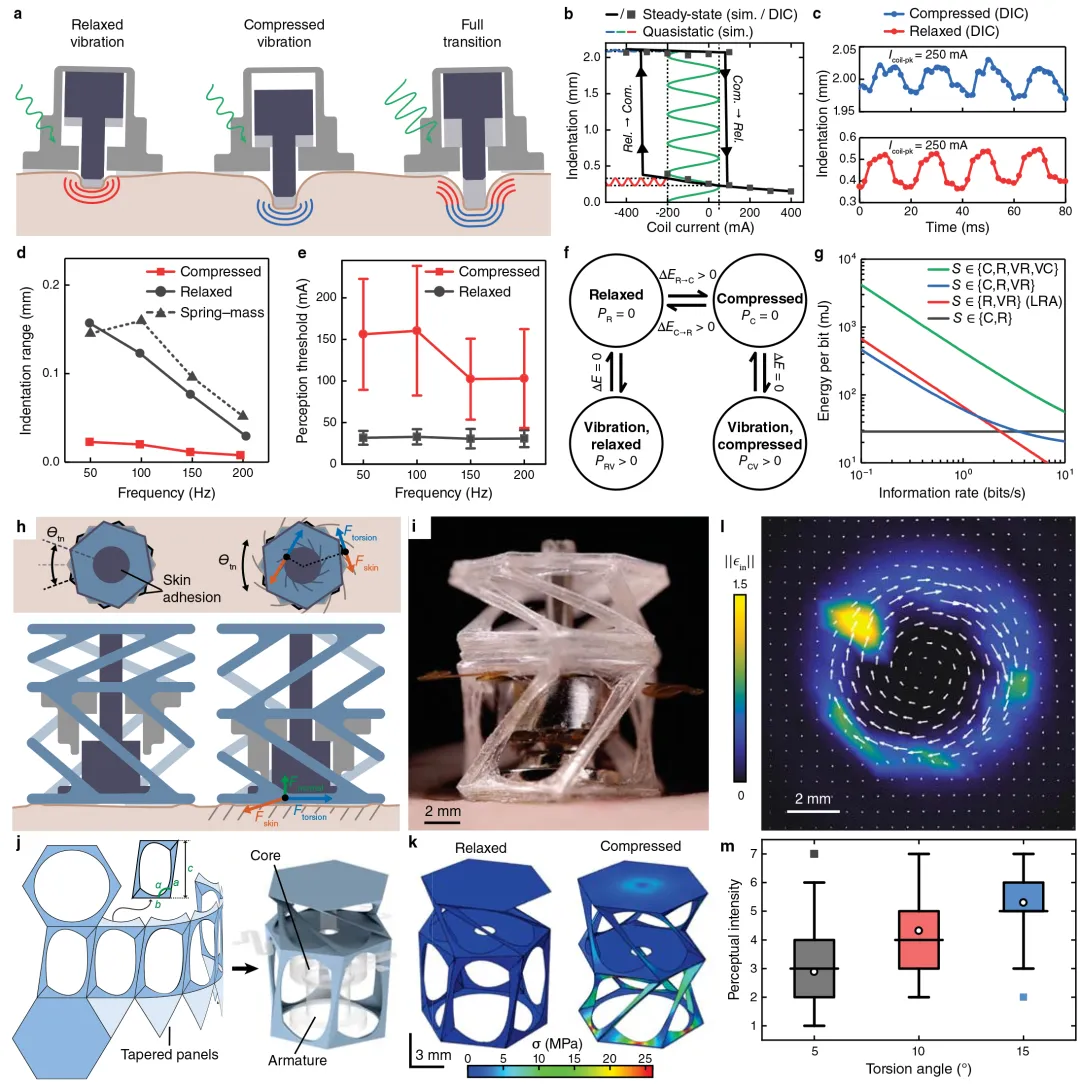 该研究发明了一种基于生物弹性状态恢复的无线、低功耗、多刺激模式触觉皮肤电子器件,通过力-电-磁控制的双稳态及压扭耦合结构力学设计,可实现对皮肤不同深度触觉机械感受器的动态和静态、法向力和剪切力的多模式激励。该可编程多模式触觉激励的皮肤电子器件在视觉、平衡感和触觉感官替代中存在广阔的应用前景。