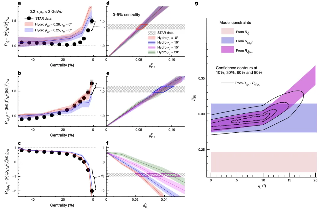 在《自然》论文中,马余刚院士团队与合作者在star实验组以接近球形的金核-金核碰撞为基准,精准成像原子核结构特征,定量提取了铀核-铀核碰撞中铀-238原子核的四极轴对称形变(β2)和三轴形变(γ)结构信息。