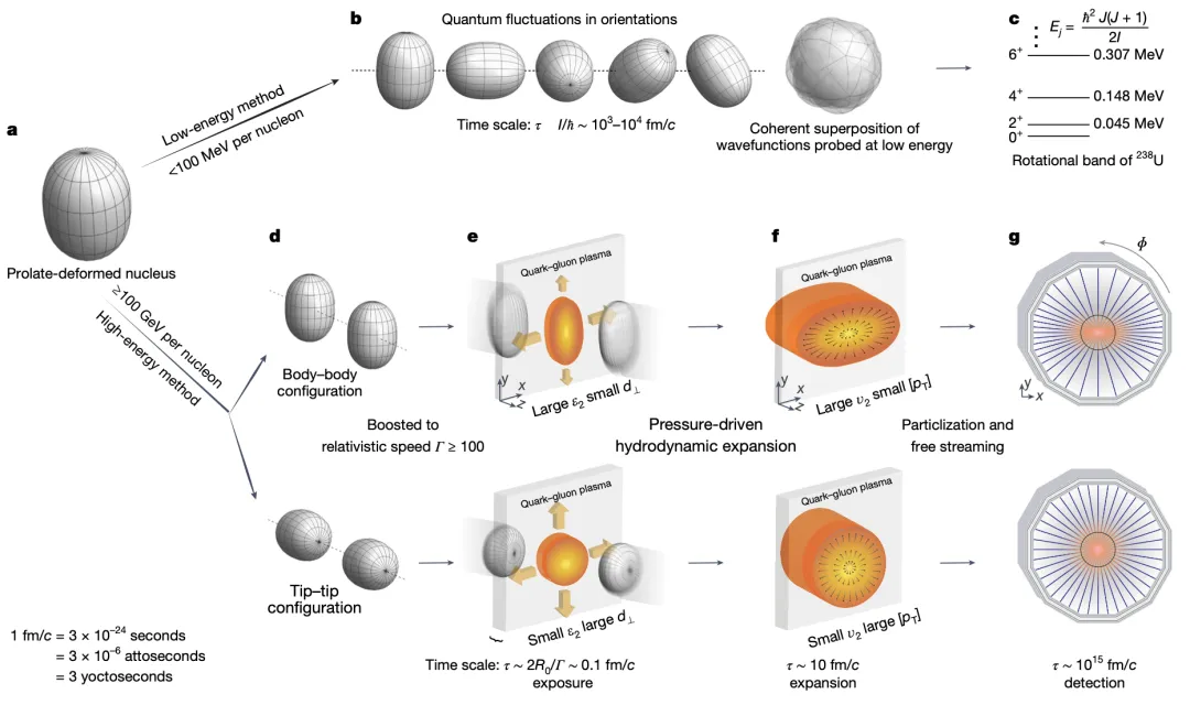相比之下,相对论重离子碰撞在成像原子核结构研究方面具有独特性。如图2所示,相对论能量下,原子核会发生洛伦兹收缩,相互作用持续时间为幺秒尺度(约 10-24 秒),远低于实验室系下原子核量子涨落的时间尺度 (约 10-21 秒),甚至比2023年诺贝尔物理学奖研究物质电子动力学的阿秒激光脉冲小六个量级。具有奇特结构的原子核在极端中心对撞区间会呈现不同的碰撞构型,这将影响初态能量沉积以及能量密度分布在qgp几何空间中的各向异性分布。