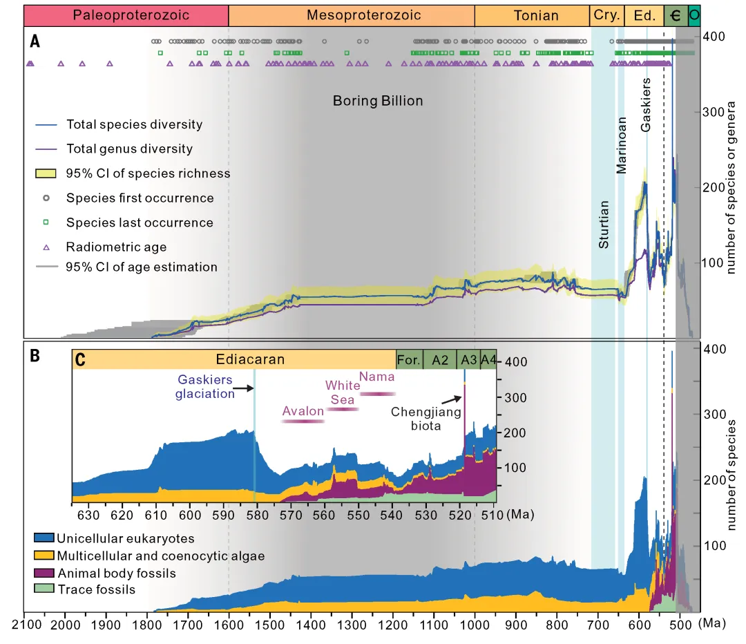 研究结果表明,随着第一个可信的真核生物化石在约17亿年前出现后,其多样性一直保持较低但稳定增长的模式。直到约7.2亿年前全球性大冰期的出现打断了生命演化的原有进程。随着大冰期事件的结束,地球物种多样性开始迅速增加并且频繁发生波动,造成多次生物大辐射和大灭绝事件。其中包括约6.35到5.8亿年前的生物大辐射事件,以及紧随其后发生的生物演化史上第一次大灭绝事件,导致当时的优势类型——带刺的微体生物大量灭绝。在此之后,形态更为复杂的宏体生物(包括动物)迎来了快速辐射。但这些复杂宏体生物在埃迪卡拉纪末(约5.51至5.39亿年前)又遭遇了两次明显的多样性下降,代表了动物演化史上最早的两次大灭绝事件。