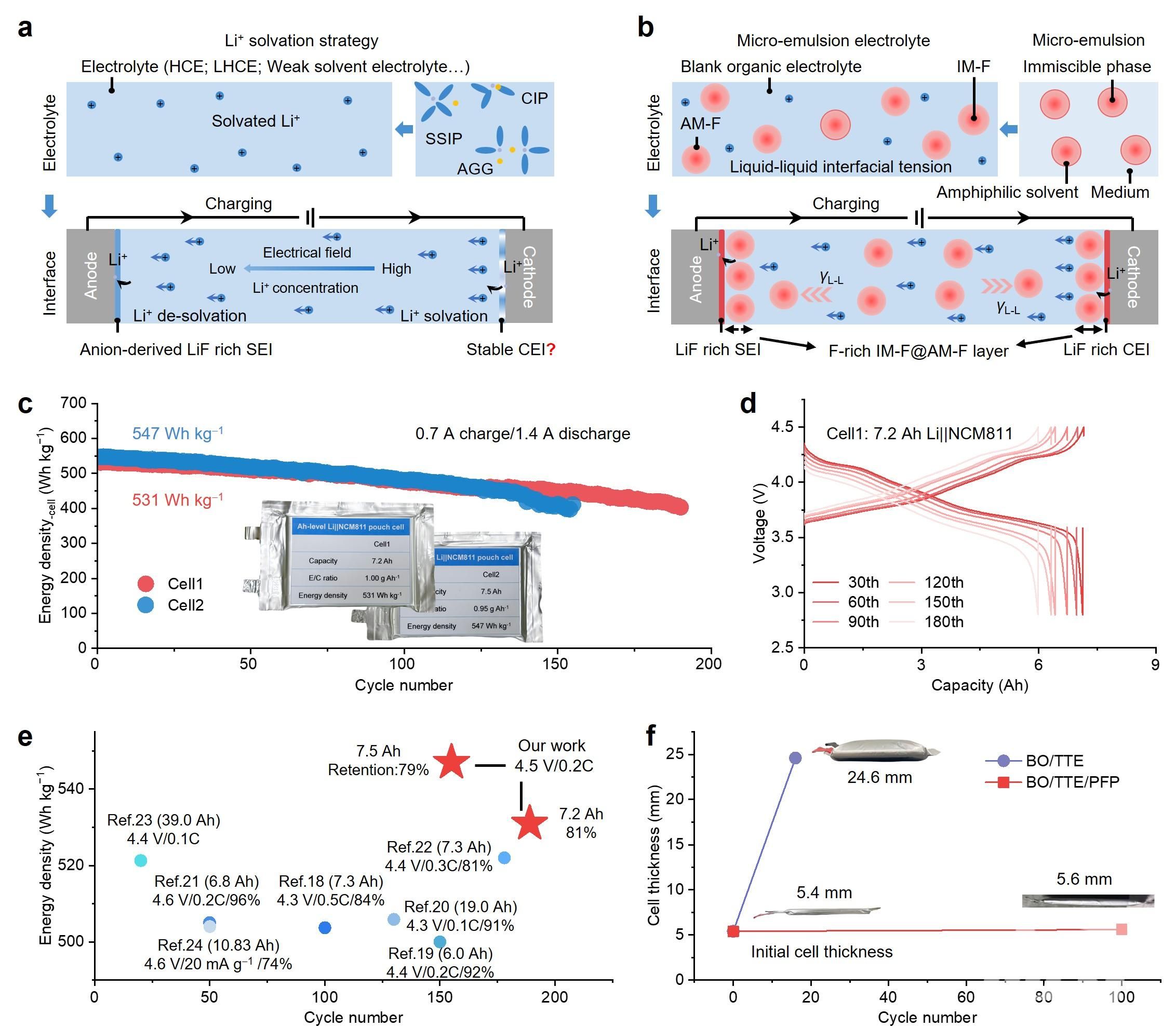 图1.(a)、(b)li⁺在充电过程的传输行为及正负极界面演化示意图,对应li⁺溶剂化策略(a)和微乳电解液策略(b);(c)li||ncm811软包电池在微乳电解液中的循环性能;(d)电池的电压-容量曲线;(e)本文与报道的电池性能对比;(f)电池在循环前后的厚度变化
