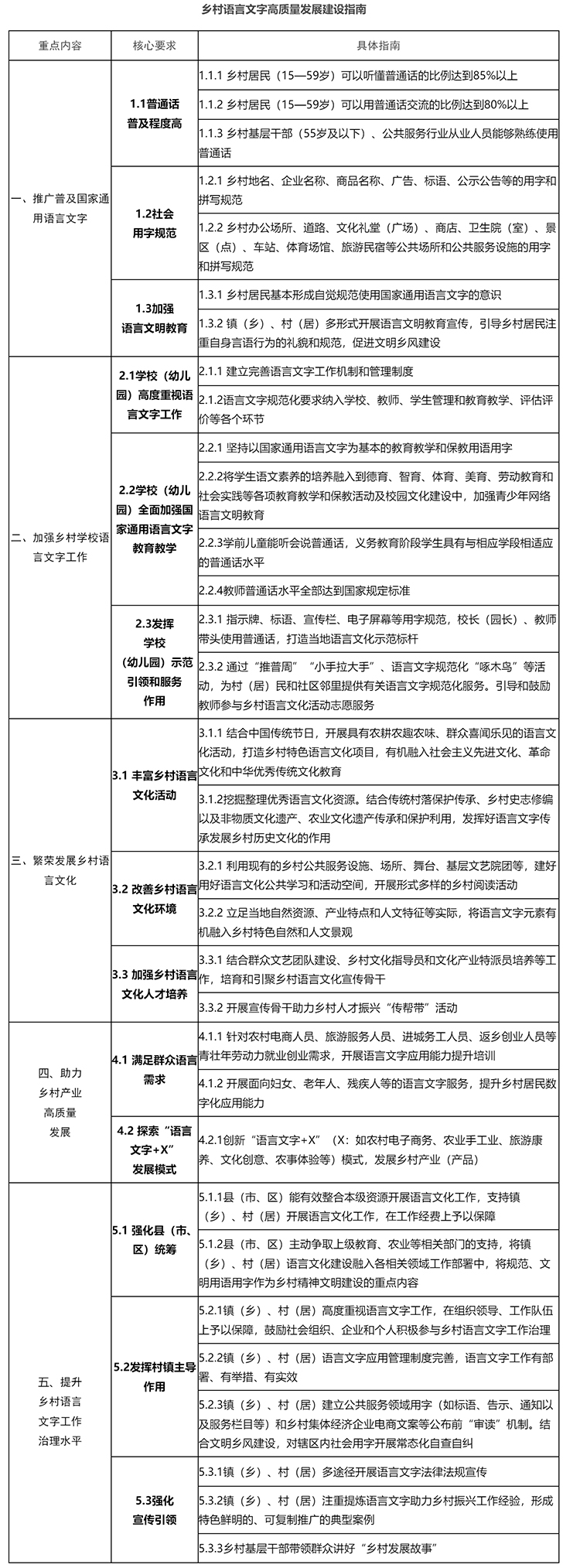 二、因地制宜、精准施策。各地要立足乡村资源禀赋,突出地方差异特色,探索符合本地实际的语言文字助力乡村全面振兴的模式。要顺应乡村发展规律,加强优秀农耕文化传承发展,推动形成语言文字服务新品牌,维护主体多元、和谐有序的语言文化生态。要加强语言文字工作指导,避免齐步走、“一刀切”,力戒形式主义、“面子工程”。